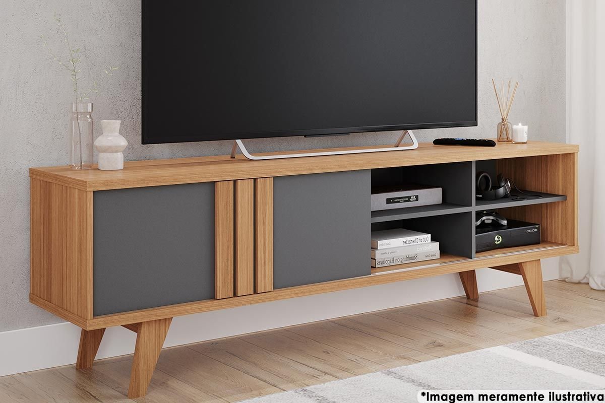 100% MDF para TVs de até 70” Portas de correr com trilho de alumínio Pés retrôs de madeira