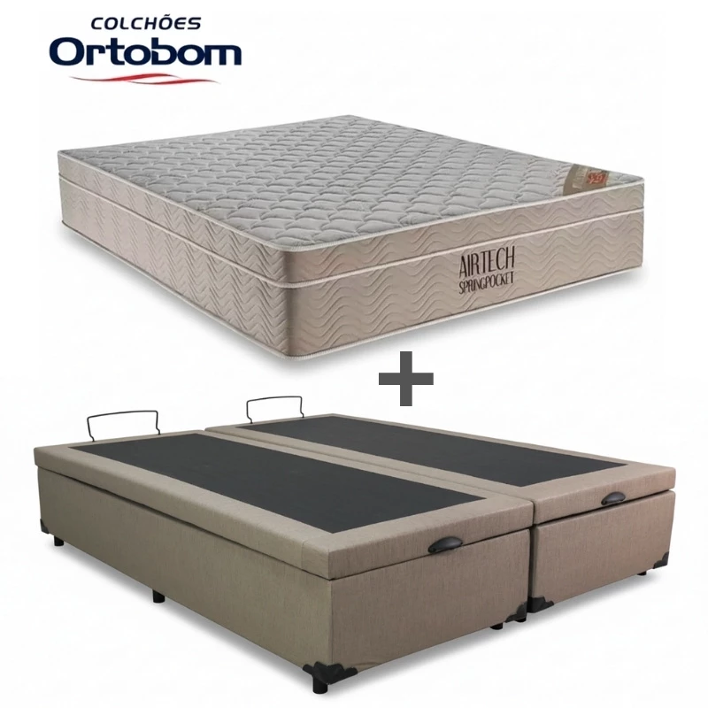 Colchão Queen Airtech Springpocket 158x198x25 Ortobom + Box Baú Queen Bipartido Eli Milão Korino Bege Blindado Nature 158x198x67 | Suporta até 240kg