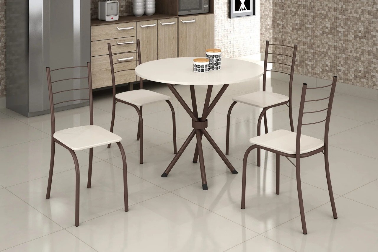 Conjunto Mesa Tubular Rio Marrom com 4 cadeiras Tampo Ardósia Circular Off White – 0.75×0.75