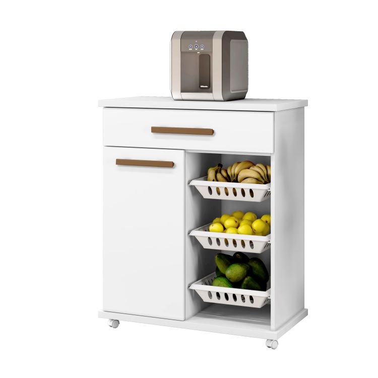 Fruteira Goiania, Côr Branco, da Arte Móveis, Meidas: Alt 0,88m Larg 0,73m Prof 0,39m Peso 27,6Kg – 2 Vo0lumes – Estrutura 100% MDP de 15mm, com Tampo e Base em MDF 25mm, 1 Porta de Bater com Dobradiças Metálicas, 1 Gaveta com Corrediças Telescópicas, Puxadores de MDF, Prateleira Interna, 3 Cestas Pásticas com Corrediças Plásticas e Rodízios Plásticos. Acabamento em Pintura UV Semi-Brilho.