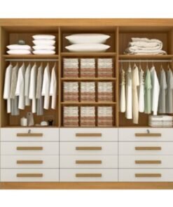Guarda-Roupa Mônaco 6 portas e 12 gavetas – Cinamomo/Off White Medidas Altura: 2.30m Largura: 2.40m Profundidade: 0.55cm Características Portas, moldura e frente das gavetas em MDF Corrediça telescópica 40cm Profundidade da gaveta 40cm Abertura total da gaveta Suporte de cabide metálico Duas gavetas com chave Produzido em chapa de 15mm Três opções de montagem interna * As imagens dos produtos são meramente ilustrativas. As cores podem mudar dependendo do brilho, tipo de câmera, ou até mesmo como as imagens são exibidas em computadores ou notebooks com telas de LCD ou LED, tablets ou smartphones, dependendo da quantidade de pixels, deixando as imagens com cores mais escuras ou mais claras.