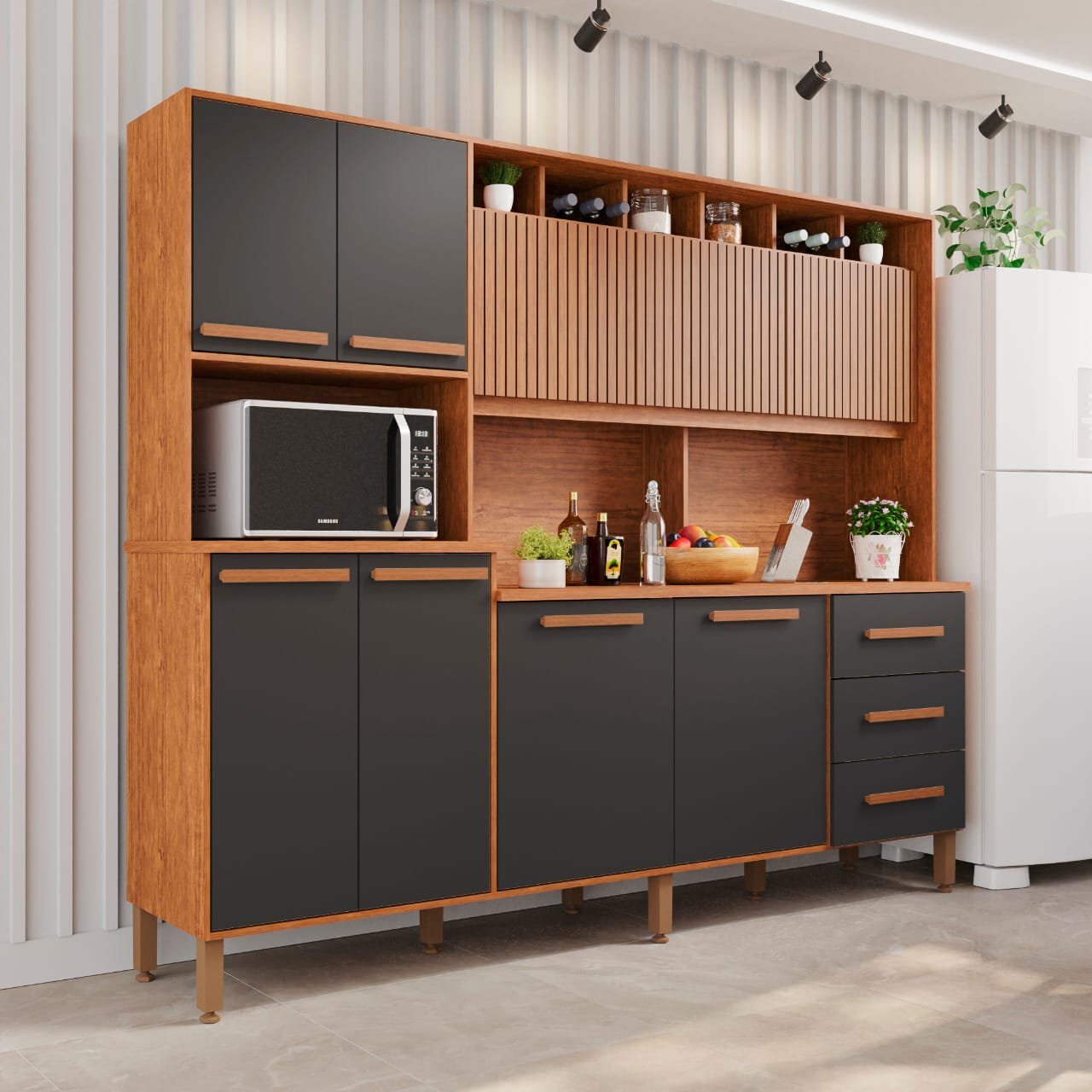 Kit Cozinha Angelina Prime Frisada 9P3G, Côr Cinamomo/Grafite, da Imop, Medidas: Alt 2,00m Larg 2,40m Prof 0,48m – Esturuta 100% MDF 15mm, 9 Portas de Bater com Dobradiças Metálicas, sendo as 3 Superiores Centrais com Detalhes Ripados, 3 Gavetas com Corrediças Telescópicas, Amplo Tampo de MDF 20mm, 2 Garrafeiros Superiores e 4 Nichos para Utensílios Domésticos e Objetos Decorativos, 4 Nichos Superiores Fechados para Louças, Eletrodomésticos e Utensílios Domésticos, 1 Nichos para Fornos, 6 Nichos Inferiores Fechados Divididos por 2 Prateleiras para Guardar Louças, Panelas ou Gêneros Alimentícios, Puxadores de MDF, Pés