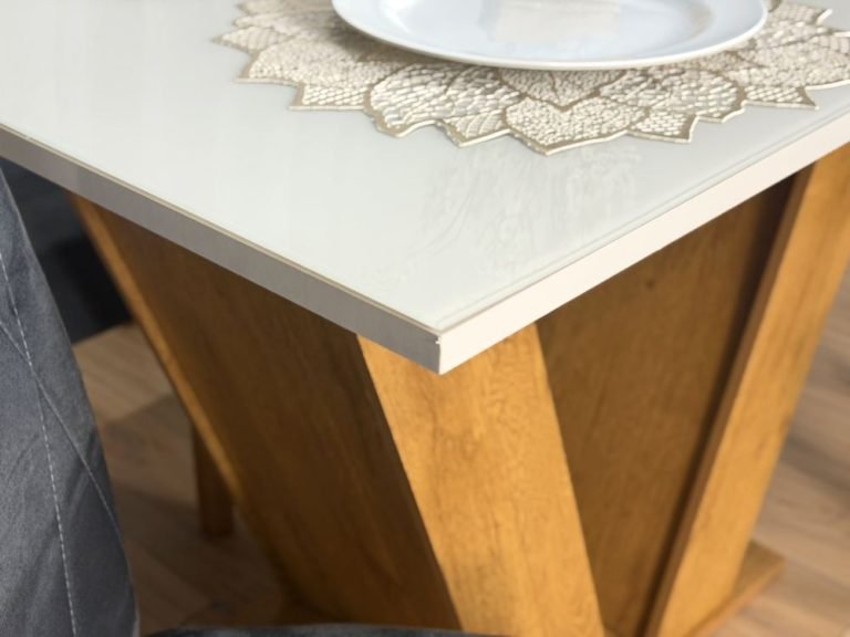 Mesa de Jantar Perla 110×75 Mel + 4 Cad. Brisa Linho Assento Bronze – Viero