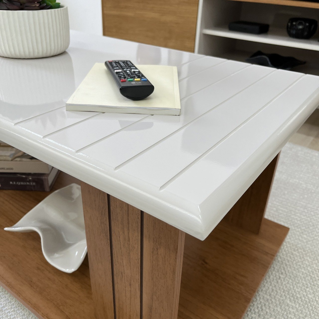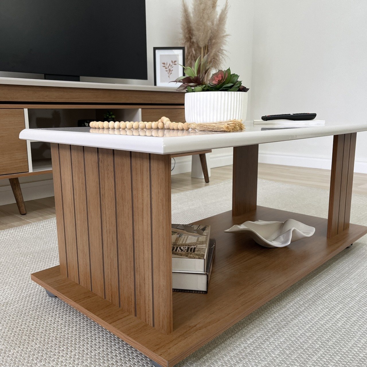 Seu visual é marcado por detalhes ripados em baixo relevo e delicados frisos no tampo, além de um design leve e exclusivo, conferindo elegância e um toque contemporâneo a qualquer sala de estar.
