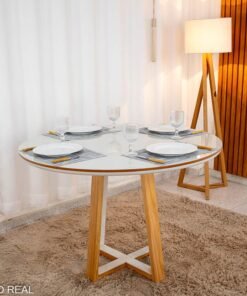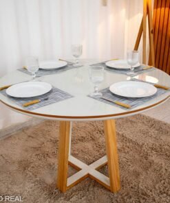 3{%%}Descrição{%%}Mesa de Jantar Atlanta Redonda 120cm Cinamomo/Vidro Off – Minas Plac