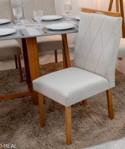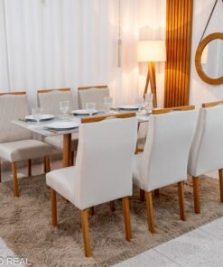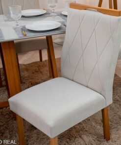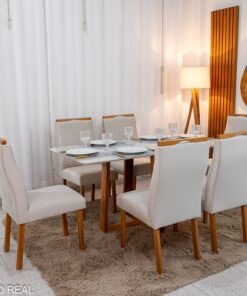 3{%%}Descrição{%%}Mesa de Jantar Pedro 160×80 Vidro Off/Base Madeira + 6 Cad. Lisboa Veludo Bege 512 Madeira Art Assento – Entregue Montada