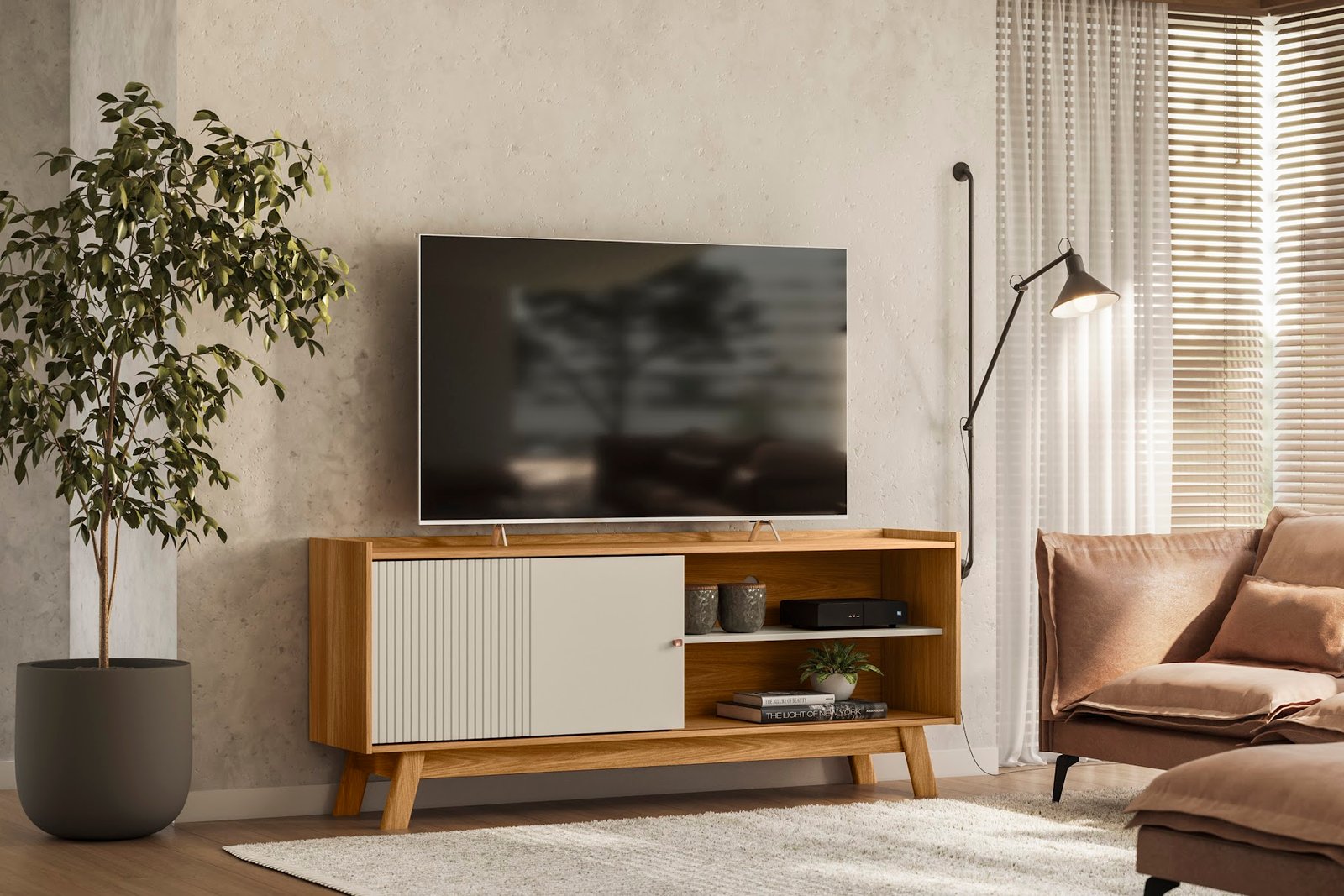 Material em MDP/MDF Tampo espessura MDP 15mm Porta de correr com detalhes em frisos Puxador cor cobre Prateleira para dispor aparelhos eletrônicos/objetos decorativos Pés no estilo retrô Ideal par TVs de até 65″