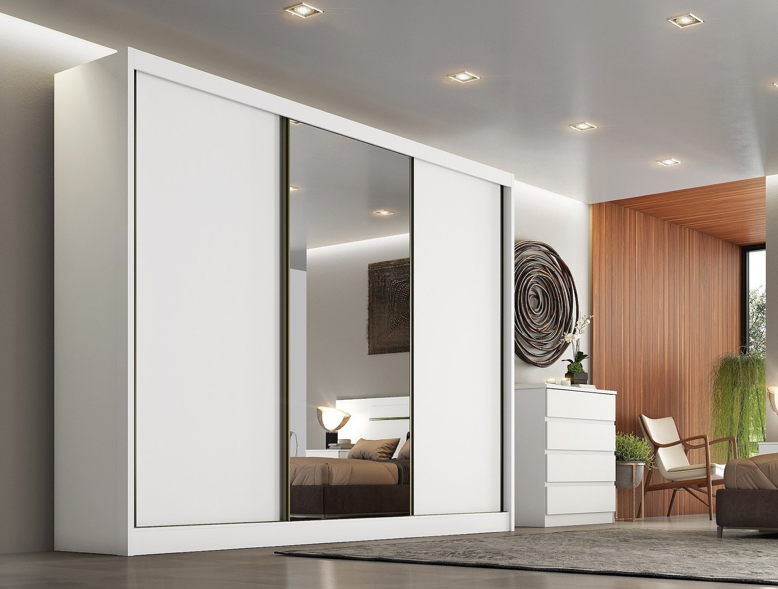 100% MDF Espelho com película de segurança Trilho inferior em alumínio e roldanas com amortecedores Perfil puxador e batente alinhador em alumínio bronze Gavetas internas com puxadores Corrediças Telescópicas 3 Portas e 6 Gavetas Porta central espelhada