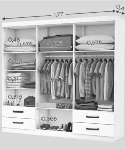 – Diferencial: Roupeiro com pés, cabideiros em alumínio e quatro gavetas com corrediças metálicas
