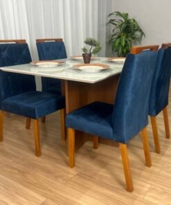 Mesa de Jantar Helo 1.20×0.80 Com 4 Cadeiras – Mel/Off White/Azul Veludo